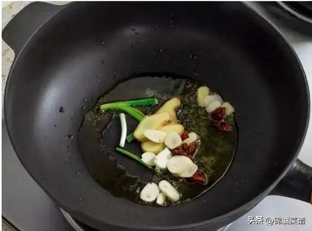3.另起锅,倒入适量食用油烧至六成热,下入葱段、姜片、蒜瓣、香叶、八角、干辣椒、花椒煸香。