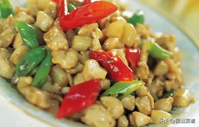3 锅留底油烧热,下葱、姜、蒜、干辣椒、花椒、鸡块炒入味,加盐、味精、糖炒熟即可。
