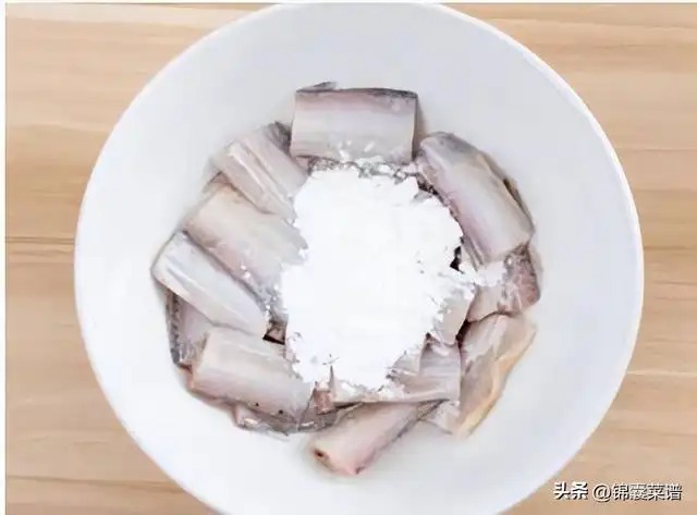 2.碗中调入盐、料酒,拌匀后腌渍 10 分钟;撒入淀粉,让带鱼均匀裹上淀粉。