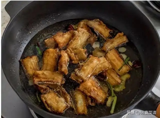 5.下入炸好的带鱼,翻炒均匀,转中小火炖煮约 5 分钟,使带鱼入味。