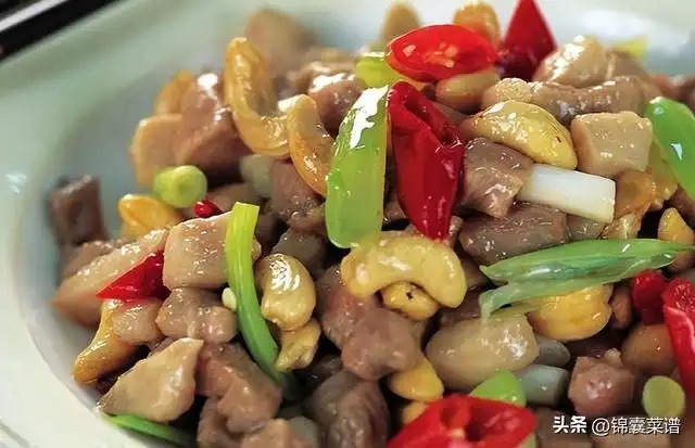 3 炒锅留底油,下泡椒段,加黄酒、清汤,用酱油、盐、味精调味,勾芡,倒入鸭丁、腰果、葱段,翻锅装盘即可。