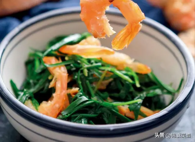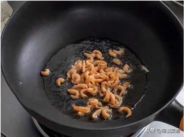 4.另起锅,倒入食用油烧至七成热,下入虾干翻炒片刻。