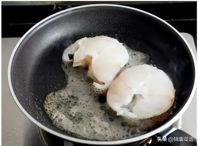 3.平底锅中倒入适量食用油烧至七成热,下入腌渍好的鳕鱼,小火慢煎两三分钟。