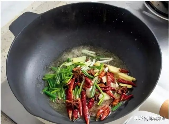 4.另起锅,倒入少许食用油烧热,下入葱段、姜片、蒜片、干辣椒、八角爆香。