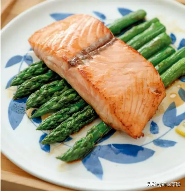 5.盛出三文鱼,与芦笋一起摆盘,挤上少许柠檬汁。