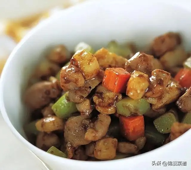 做法 1 鹅脯肉切丁,加盐、水淀粉上浆,滑油,盛出;胡萝卜丁、莴笋丁用油焐熟,待用。