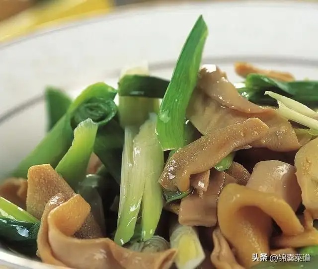 2 锅中加油烧热,煸炒青蒜段和鹅肠段,加盐、味精、料酒、胡椒粉调味,用水淀粉勾芡,炒匀即可。