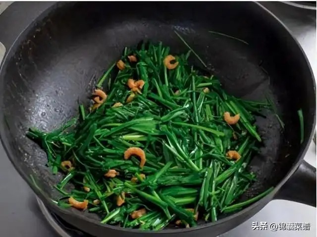 5.下入韭菜,翻炒至韭菜变软,调入生抽,大火翻炒几下即可出锅。