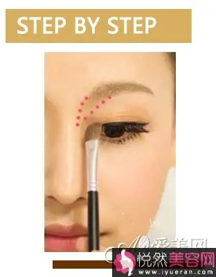 喜欢眉形干净的mm,可以用沿眉毛轮廓涂刷些许粉底。眉头和鼻梁的过度不能忽略哦,蘸取少量阴影粉刷在图示位置,能令眉毛和鼻梁都显得更为立体,一箭双雕。