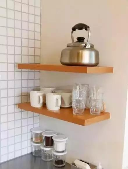 连角落空间都不放过,简单两层木板,就可以把常用的调味料、杯子、茶壶摆放上面,用的时候,顺手拿取即可。调料瓶用透明塑料的,分成小份,贴上标签,放在灶台边上。拿取非常方便。