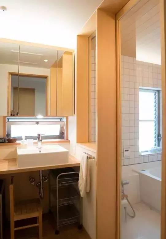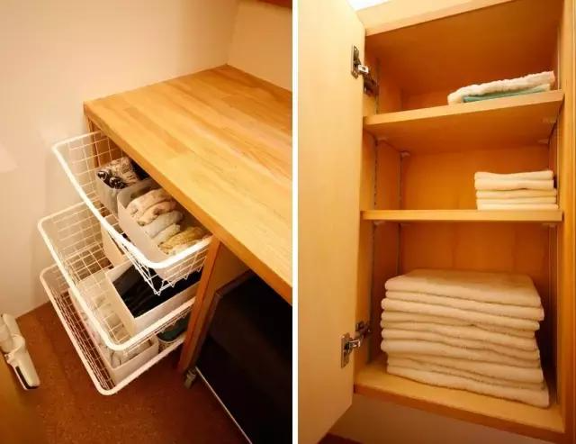 日本家庭非常喜欢用收纳篮和多层柜,事实证明,这也是实用功能最强的两样收纳利器。抽拉篮分为多层,可以把换下来的脏衣服放进一层,另外带进卫浴间的需要换洗的干净衣物,可以放进另一层,合上之后,洗澡时也不怕淋湿。洗浴的毛巾,叠放整齐,放在橱柜里,很有条理。