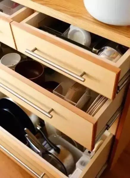 这样多层收纳柜非常实用,内部的多层格子适合各种不同餐具的分类,筷子、叉子放在第一层,锅等大的用具放在底层,中间可以收纳一些常用的杯子、罐子。抽屉在离备餐台最近的地方。现在的橱柜定制都有这样的抽屉。