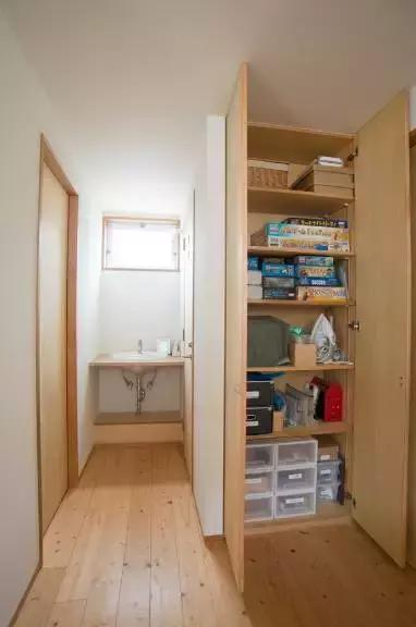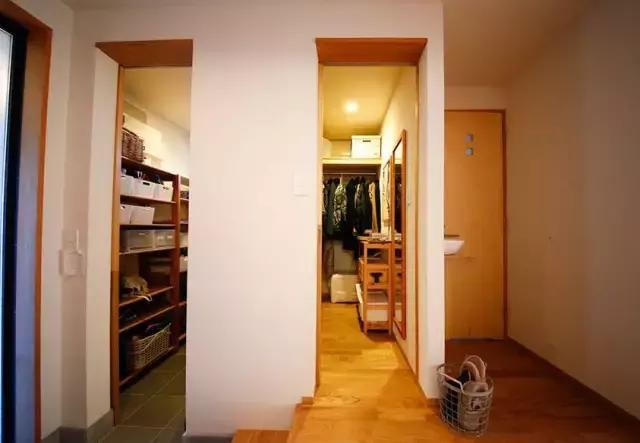 玄关位置有两个小房间,左边房间用来收纳室外杂物,右边则是入口壁橱。即便客人进来,也不会看到放满衣服的玄关。