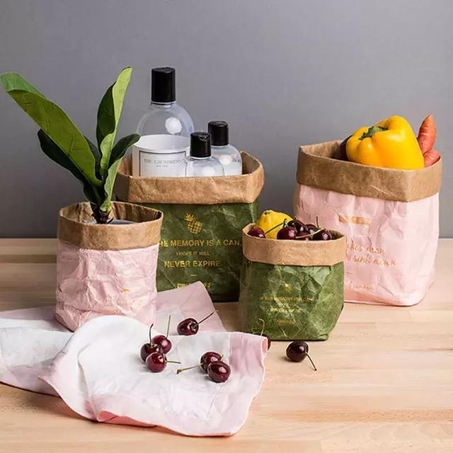 如果是厨房的一些水果或者展示类物品,编辑推荐这款北欧可水洗牛皮纸收纳袋,防水性能好,撕不烂,又美观,不用的话就折叠起来又不占空间。