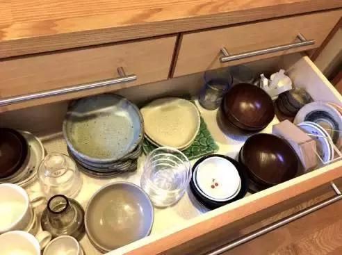 颜色造型较为复杂的日式餐具则被藏进抽屉里,不会让外部显得混乱,盘子按照大小分区域摆放,非常整齐。
