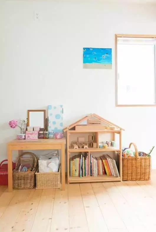 桌子可以设计成简洁样式的,那就可以直接把收纳好的篮子放在桌子下面,充分利用空间,多层落地书架可以收纳孩子的图书,而且设计成房子的样子,非常有趣,森山很好地考虑到了小孩子的乐趣。