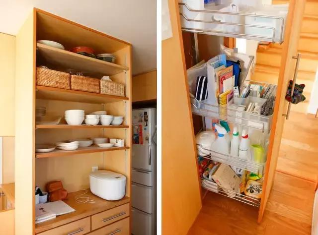旁边的抽拉篮也是非常棒的收纳工具,使用频率较低的塑料饭盒,清洁工具都可以分类放进去,这样的拉篮可以在单独购买,但现在很多橱柜定制时,就直接配有拉篮,隐藏在缝隙里,也不占用空间。
