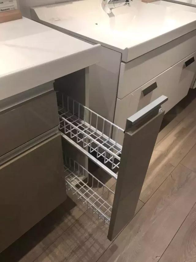 最近编辑在松下展厅看到的一款镜柜,大开眼界。上图是镜柜洗面台的收纳格,那么小的位置都不放过,可以用来放橡皮筋或者面膜粒,考虑得太周全了。