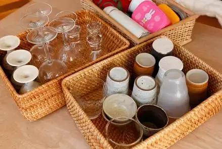七零八落的茶杯、玻璃杯就用原木色的藤编收纳筐装起来,这样即使放在橱柜最高处,用的时候,也可以一下拿取,而且很安全。这样日式收纳篮很美观,也很流行,也可以选择塑料透明箱,由自己的喜好而定。