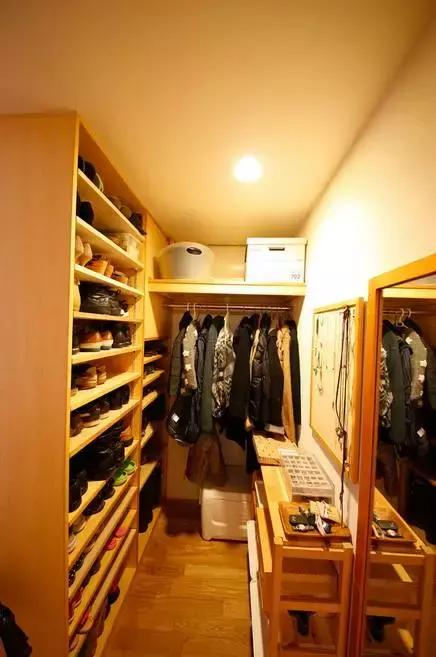 玄关处被做成了衣帽间。从大衣、鞋子到饰品都放在里面,不论外出还是回家都可以在这里整理衣物,轻松实现室内外的装束转变。这一点在中国家庭不是很适用,现在很多户型本身不会为玄关留出这么大的空间,但是其中的收纳方法不妨借鉴学习。