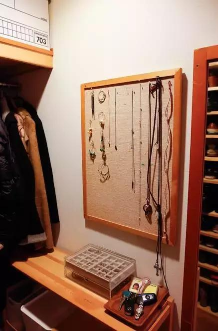 森山到家的第一件事,是先把首饰取下来。所以,玄关成了一个更换衣物的场所,特地安装了首饰收纳区和超大的穿衣镜。这个收拾收纳壁挂和盒子非常好用,壁挂上可以悬挂项链、长的二环手镯等饰品,而格子首饰盒择可以用来收纳耳钉,旁边的小盒子还可以收纳房间钥匙、车钥匙等,分门别类,一目了然,出门看一眼也不会忘记。梳妆台的下面都有大量的储物空间。在中国家庭的话,可以把这些收纳工具放进卧室。