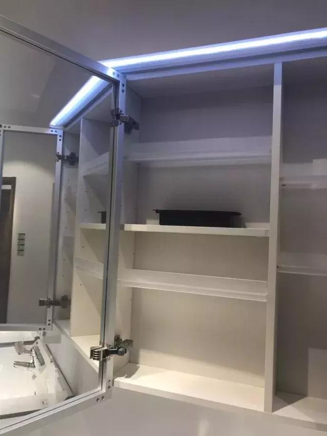 双面镜柜,里面也是镜面设计,可以360度看到自己,整理发型方便多了。而且镜子旁边有一圈灯带,方便爱美的你补妆。