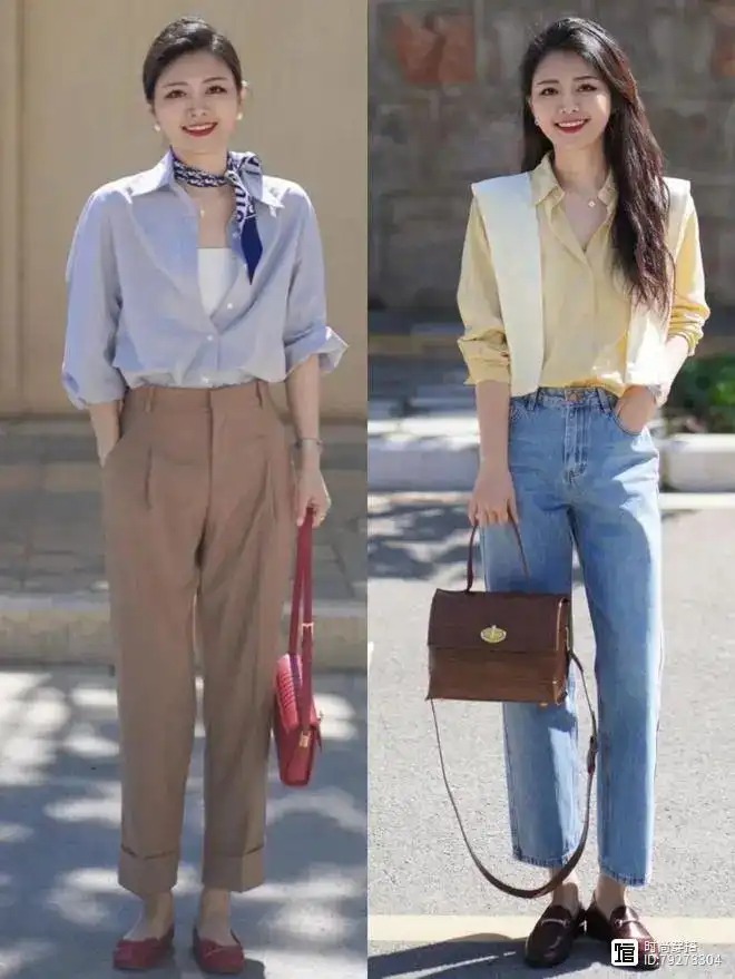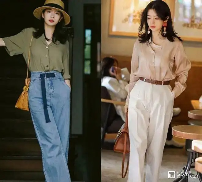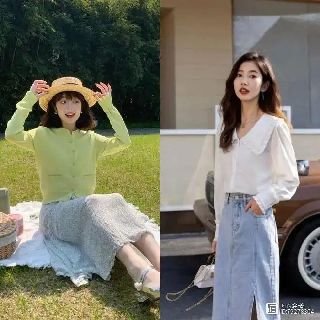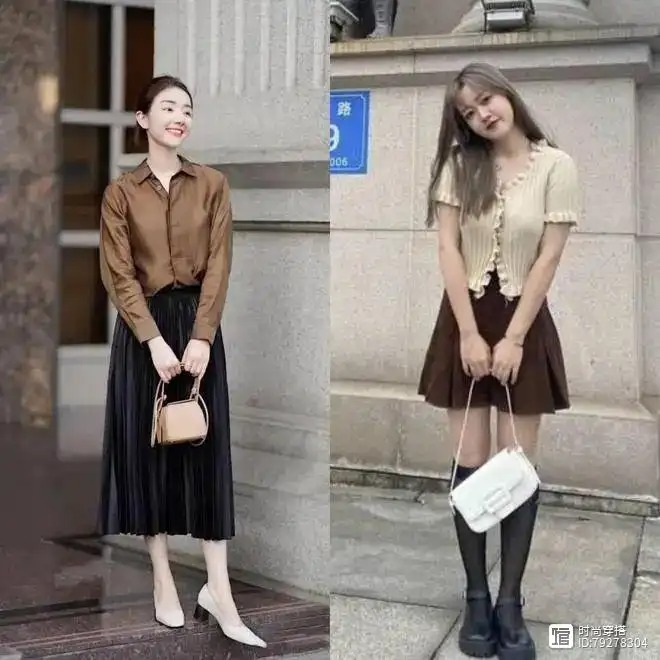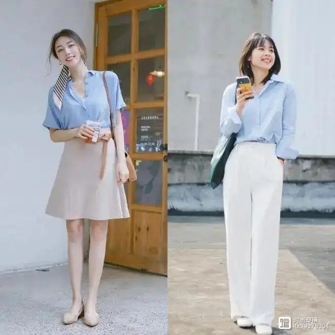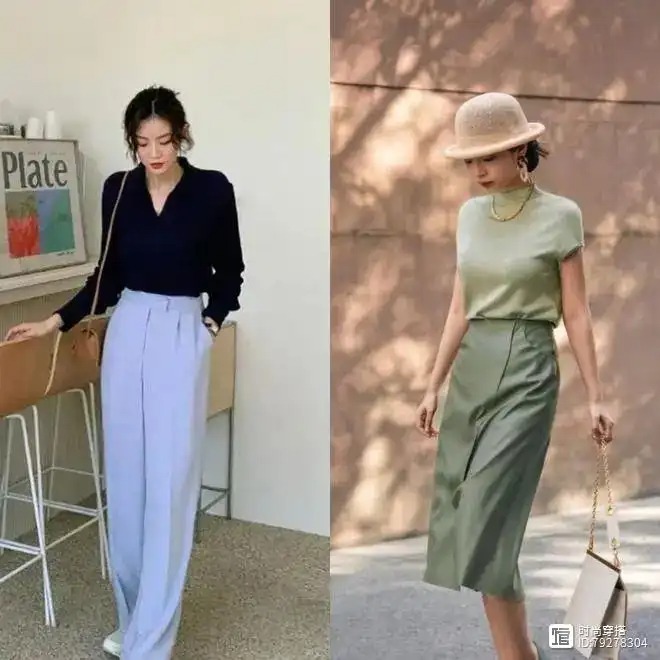 例如,黑色衬衫搭配蓝色阔腿裤,通过添加深色系统来降低整体亮度,防止裤子过于明亮和耀眼,避免审美疲劳,缓解外观和感觉。浅色上衣搭配深绿色裙子,上下半身比例通过一深一浅的方式明确,效果更好。