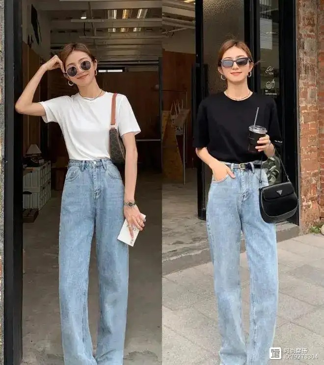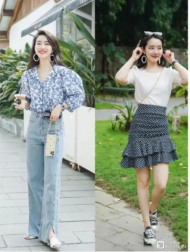 可以参考这两组的外观。如果你想突出哪一部分的特点,你可以选择相应部分的设计风格。如果你专注于上半身,你可以穿一件带泡泡袖的碎花衬衫。蓝白相间的配色清新耐用,也能衬托出白皙的肤色。搭配蓝色牛仔裤,深浅搭配,身材比例更清晰。
