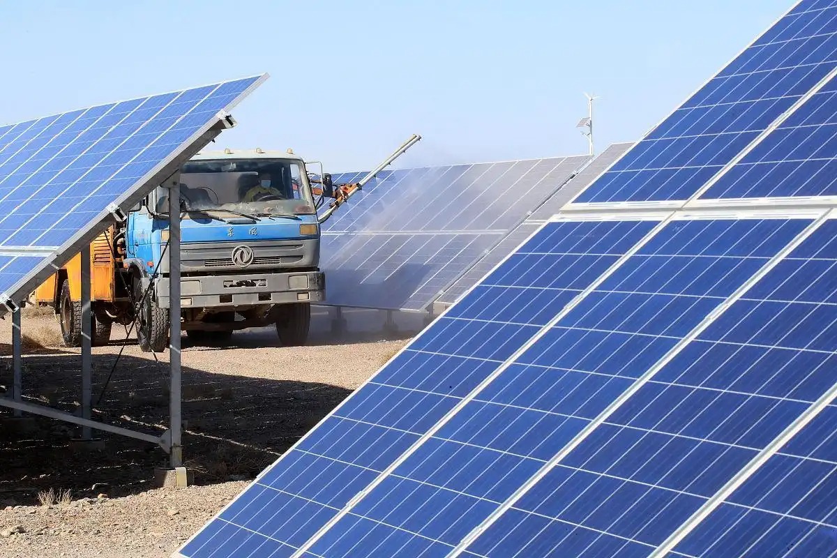 人工水洗是以接在水车上(或水管上)的喷头向光伏组件表面喷水冲刷,从而达到