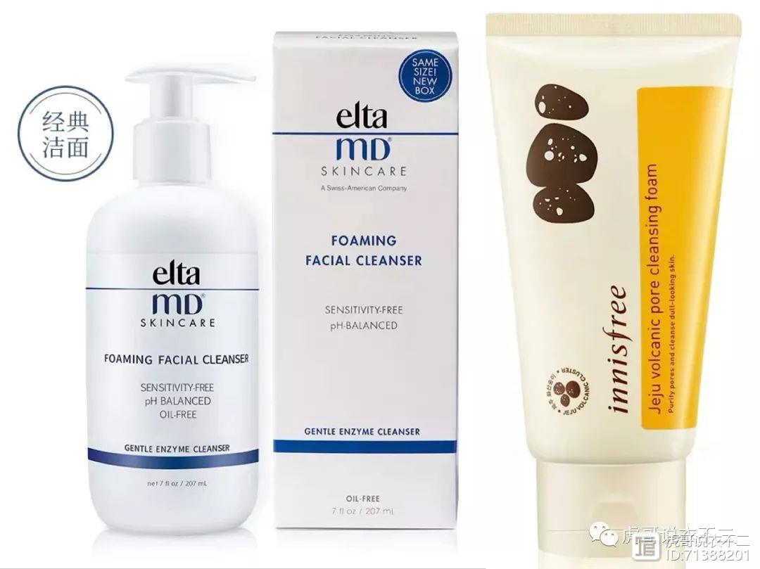 接下来洁面的步骤,大家都知道洗面奶的种类分为皂基和氨基酸两种。氨基酸洗面奶主打温和配方,但它的清洁力度不强,不适合在脸部油脂分泌旺盛的时候进行使用,但是日常使用是完全可以的,可以和皂基洗面奶搭配使用更有利于皮肤的维稳。氨基酸洗面奶最有名的是Elta MD,皂基洗面奶也可以选择清洁力度强一点的悦诗风吟火山泥面膜,里面有小小的颗粒,对去除废旧角质有很好的的作用。