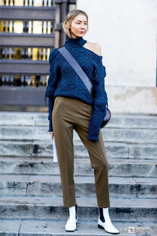 有轮廓感的粗线毛衣更适合搭配线条流畅的锥形裤,选择冷色调的毛衣搭配冷色调的裤子,会让穿搭更显气质。比如今年流行的孔雀蓝色毛衣搭配深棕色锥形裤,或者是红色毛衣搭配黑色锥形裤,满满的高级感。