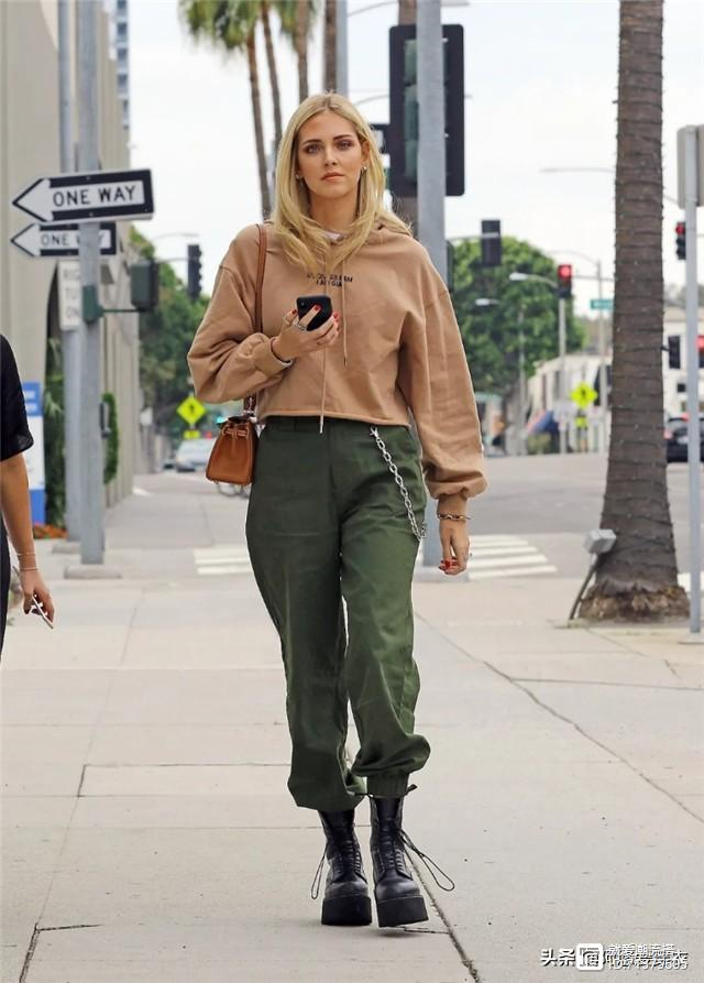 由于工装裤本身属于宽松版型,因此高腰的工装裤搭配短款的卫衣,更显瘦显身材比例好。而脚上一定要穿双裸靴或者是马丁靴。如此搭配,适合喜欢中性风格或者是休闲风格的装扮的女生,会比其它搭配方式更好看。