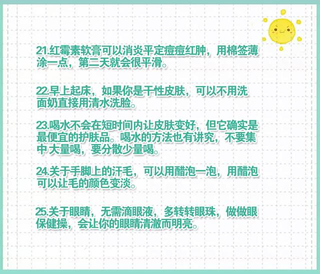 24.关于手脚上的汗毛,可以用醋泡一泡,用醋泡可以让毛的颜色变淡。