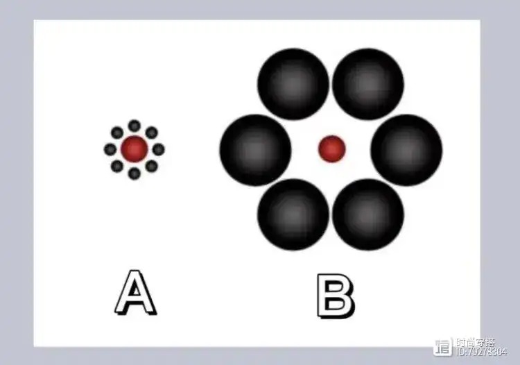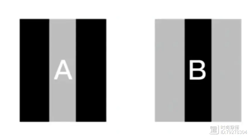相信绝对多数人都会觉得B更窄一点,但实际上他们是一样宽窄的,这就说明了,内深外浅是更显瘦的。因此,当集美人使用衬衫.西装敞开穿着时,就可以利用这个小技巧,绝对显瘦!事实上,答案是一样的,A和B的大小是一样的,但由于周围的参考,两个红点的大小会有所不同。在穿着上,我们也可以利用这种视觉差、头肩比例不协调的姐妹,可以适当地用垫肩来调整,这样就不会显得头轻脚重了。如果你想完全得到穿着显瘦的东西,最重要的是要认清自己的身材,这样才能对症下药,气质。