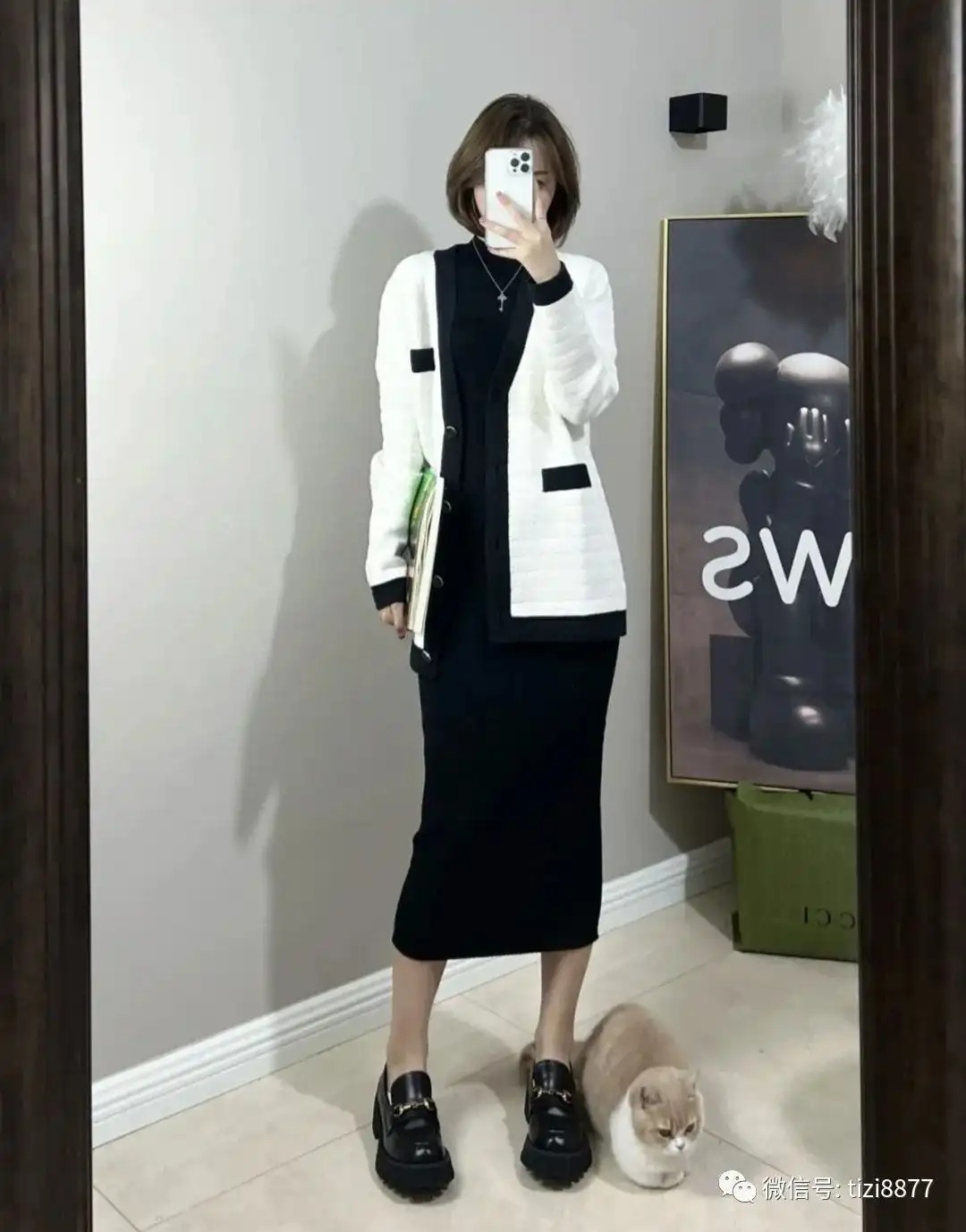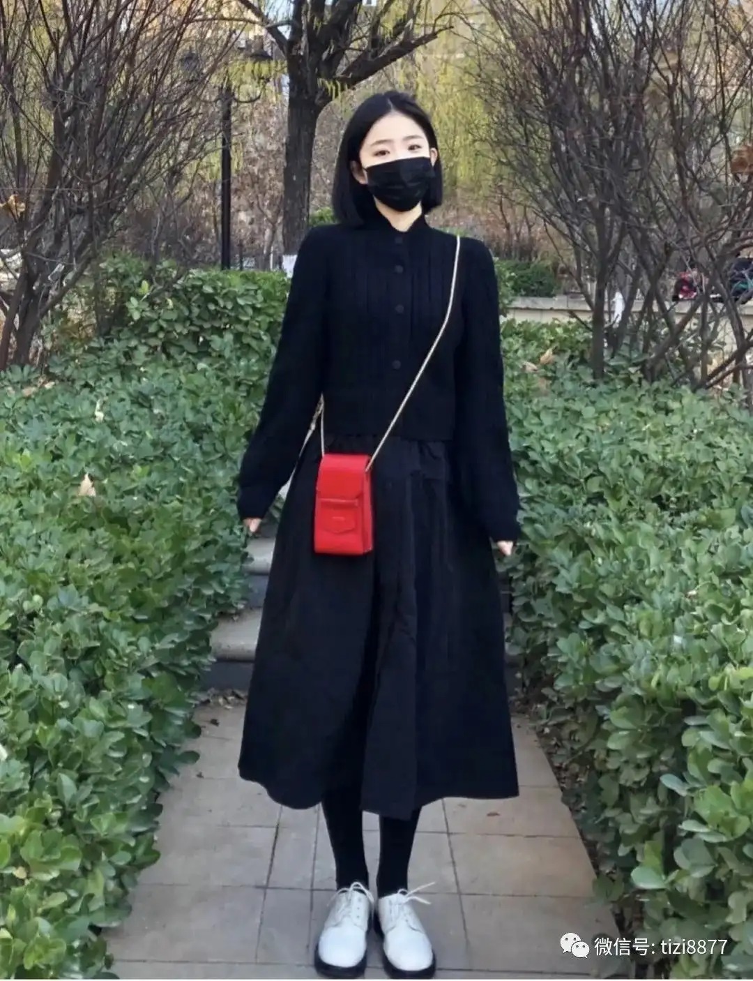 秋冬季里必备的一条黑色针织裙,姐妹们必须人手一条。不仅凸显身材,且百搭显瘦,建议搭配一件宽松的针织开衫,配上一双小皮鞋,绝绝子的温柔女白领,天气再冷一点可以穿上一条光腿神器+厚外套~