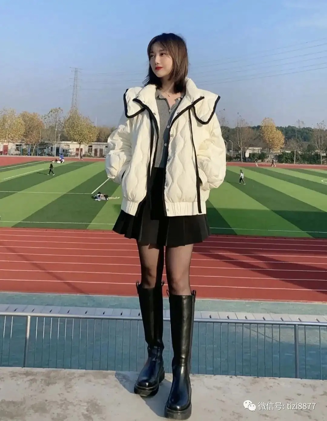 look15 短款羽绒服+卡其色毛衣/格子短裙