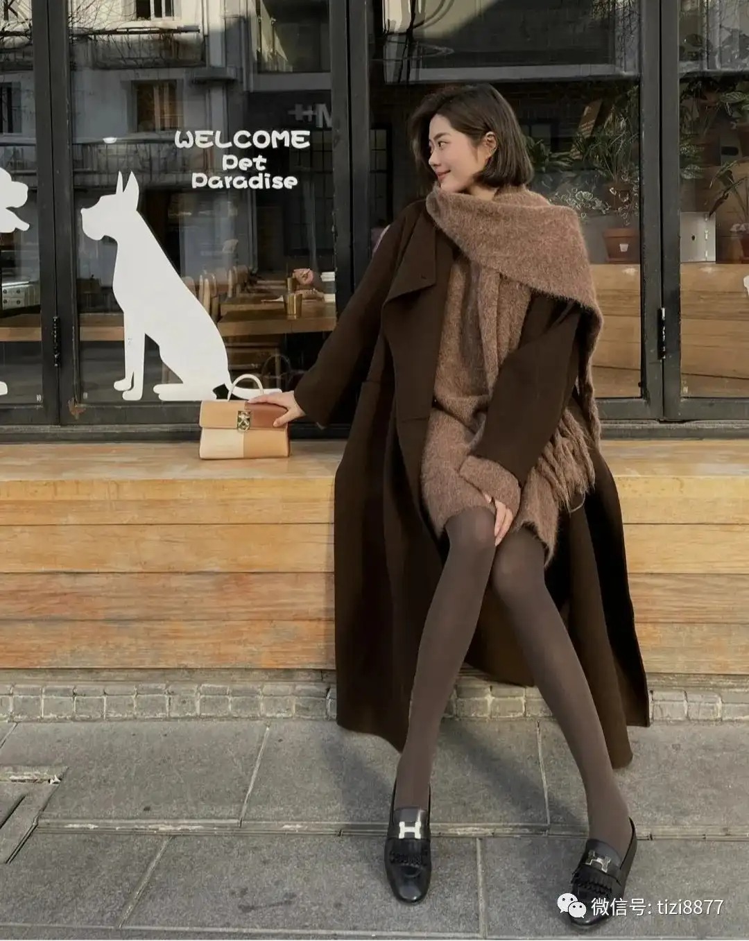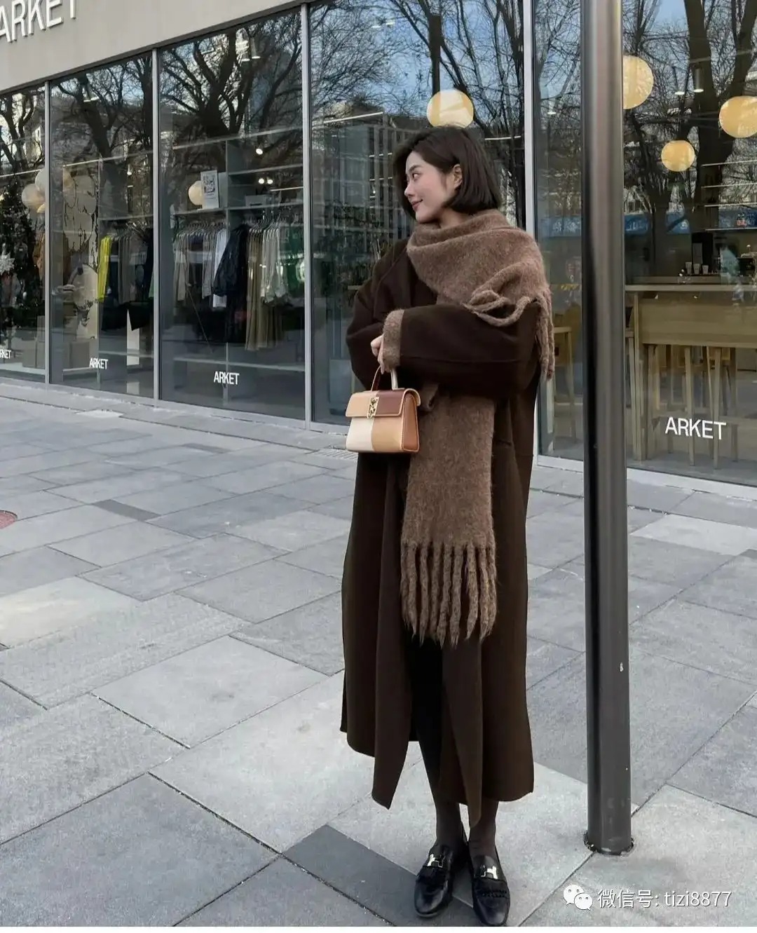 这身大地色的搭配就像是一杯浓郁的热巧克力。冬天穿棕色系可以说是温暖又有气质,棕色的大衣里面搭配了棕色的马海毛连衣裙,层层叠叠的棕色就是了,马海毛围巾一围real保暖~