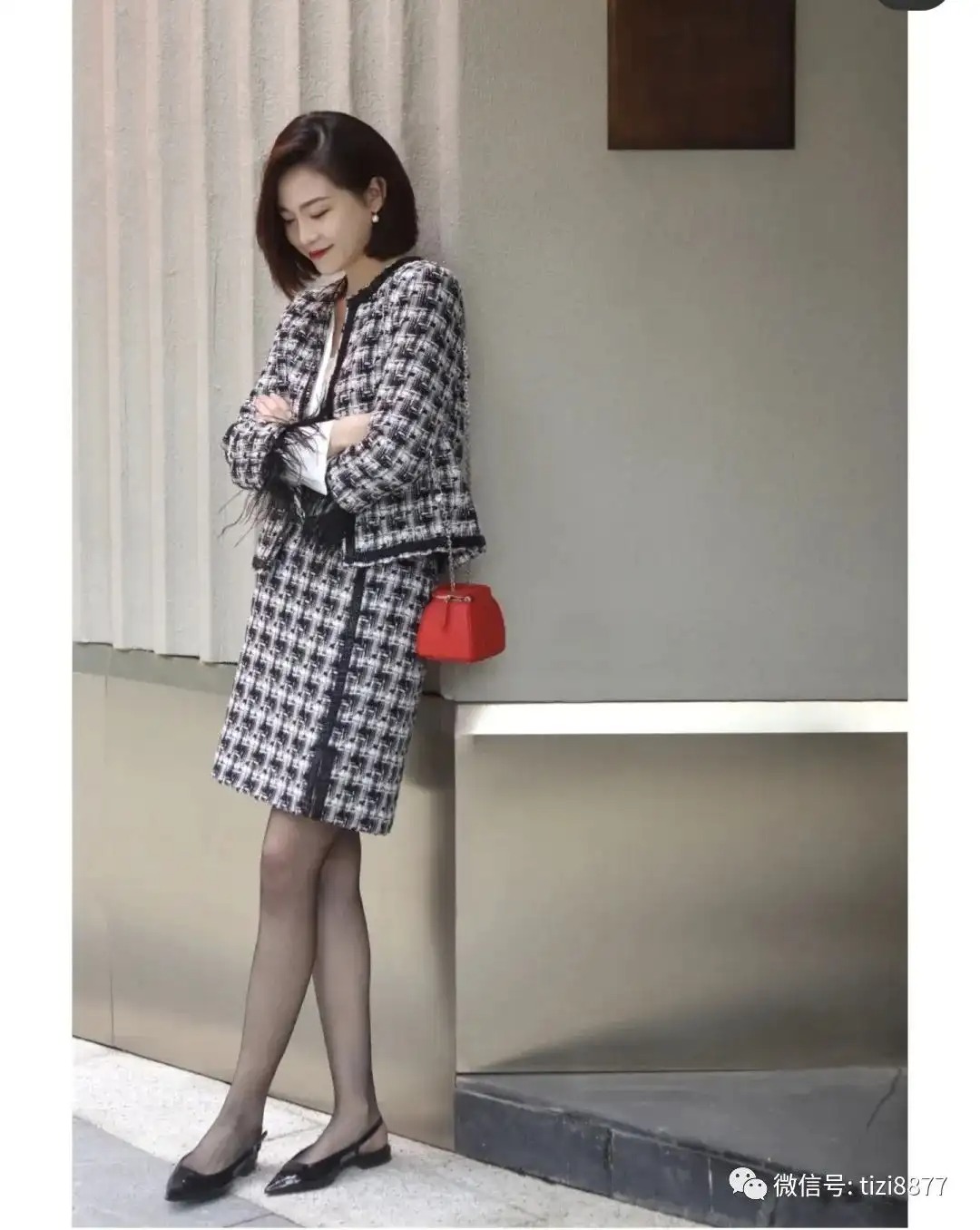 温柔女人味的小香风look:这件小香风很特别,袖口的毛毛感娇俏又可爱,看不腻的黑白拼色,大气又优雅,看起来有些正式,用黑丝和大红色小手包中和一下又变得轻松许多~