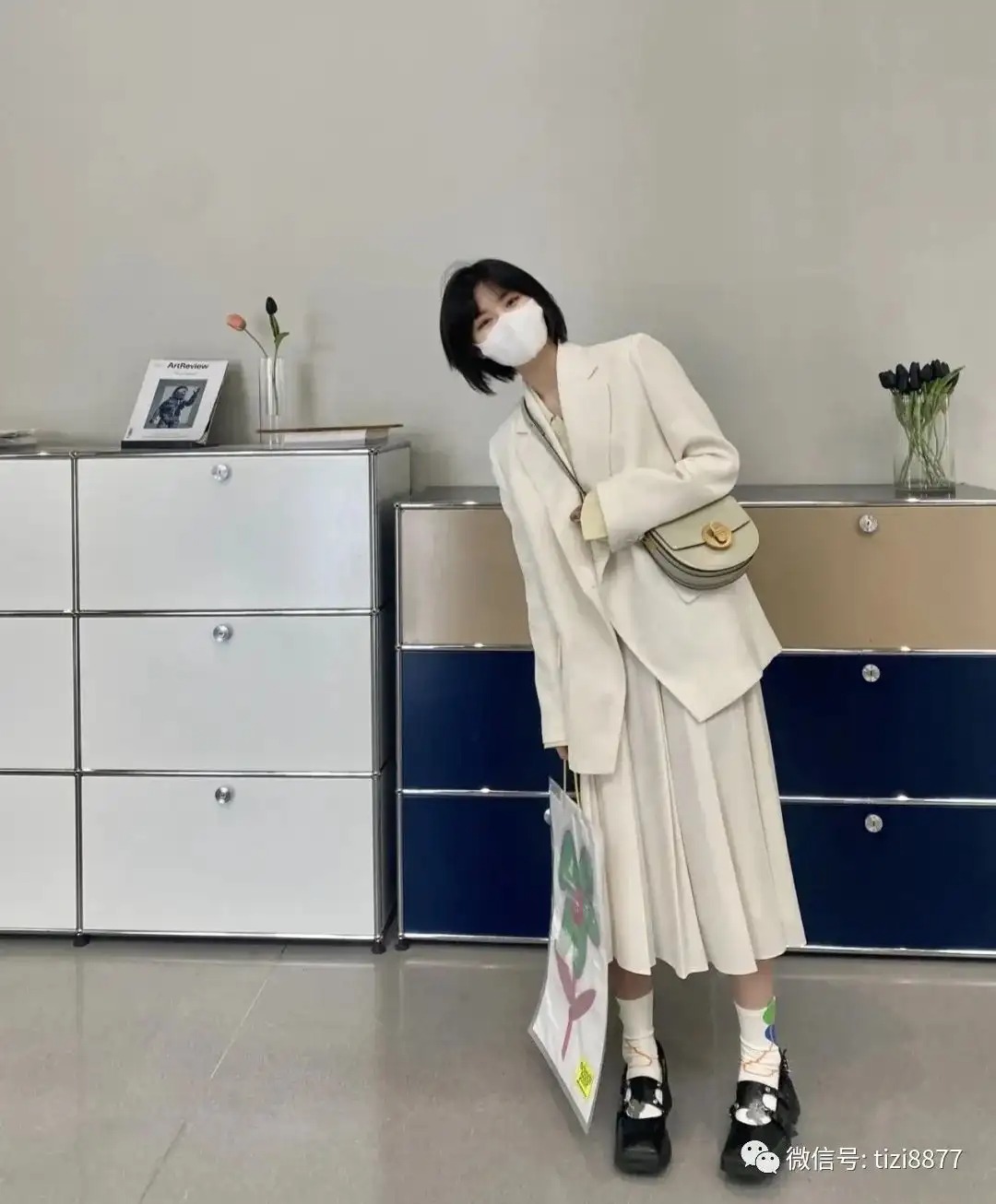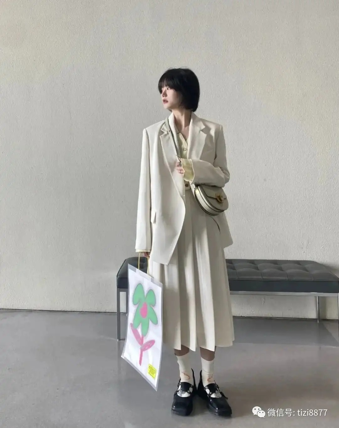 短发女孩的仙气飘飘的OOTD:米白色的西装+百褶长裙的套装,一整个仙里仙气住了,也很适合平时通勤上班穿,很显气质and高级感!