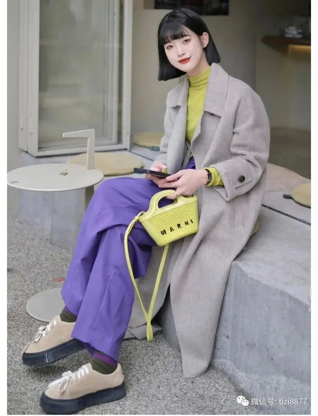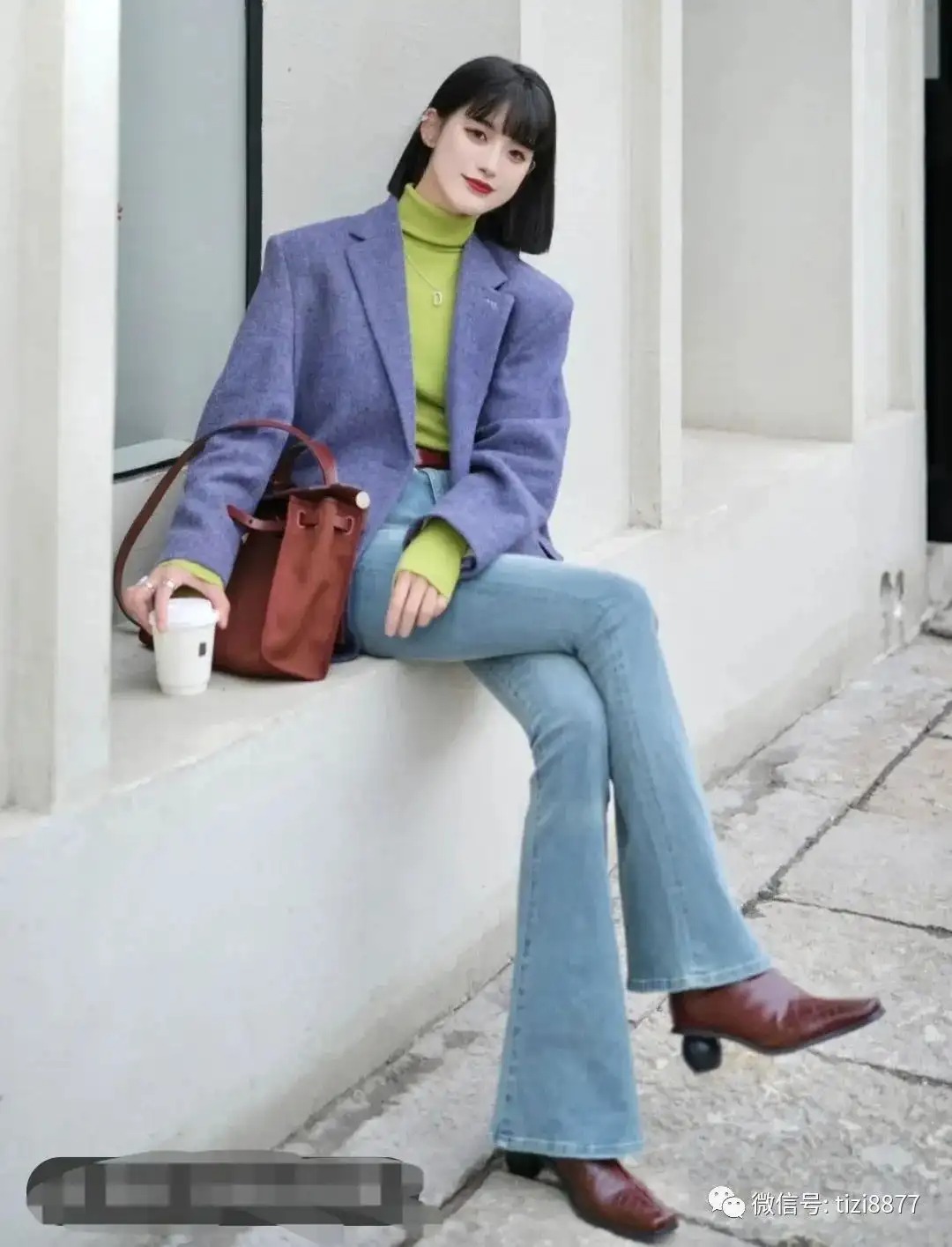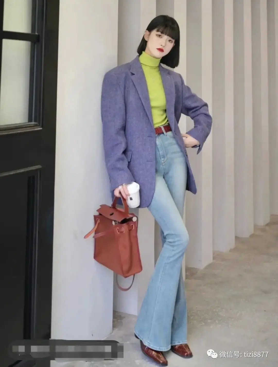 这身搭配的思路是紫+绿,紫色呢子西装+绿色高领针织,搭配牛仔喇叭裤和皮鞋,不用缩头跟拉腿的一套look,显比例又显气场,秋冬通勤也没问题,复古老钱风的感觉,每个单品单独拿出来都经典。