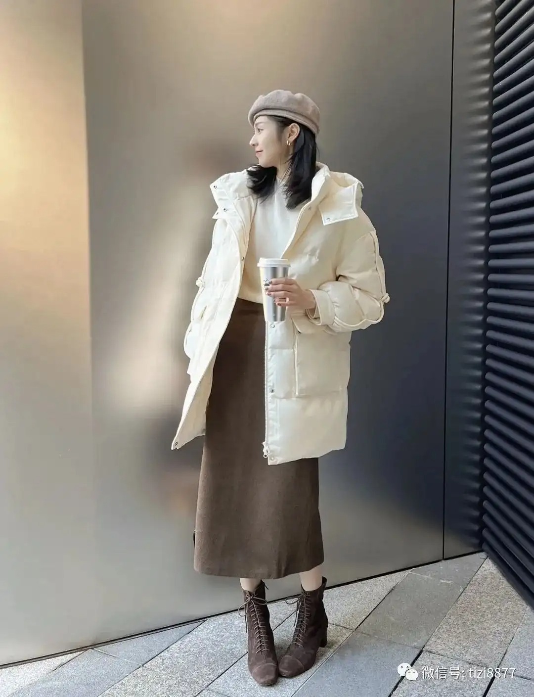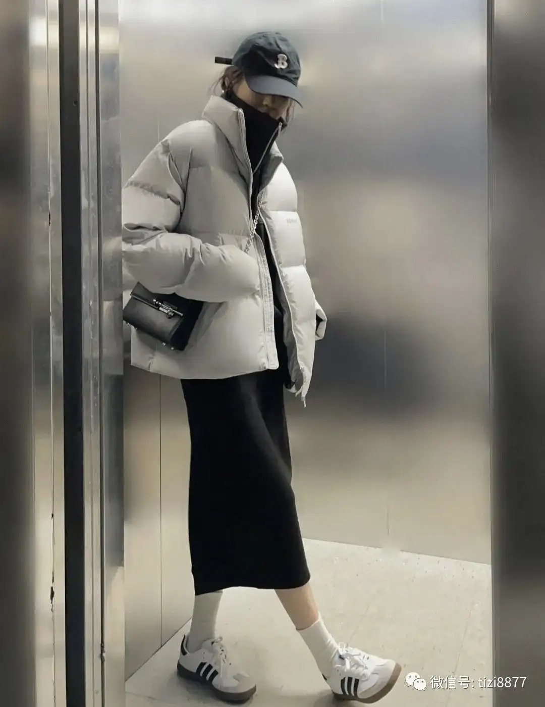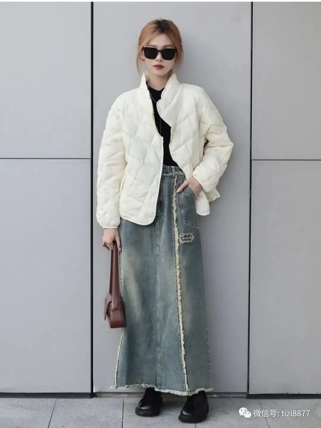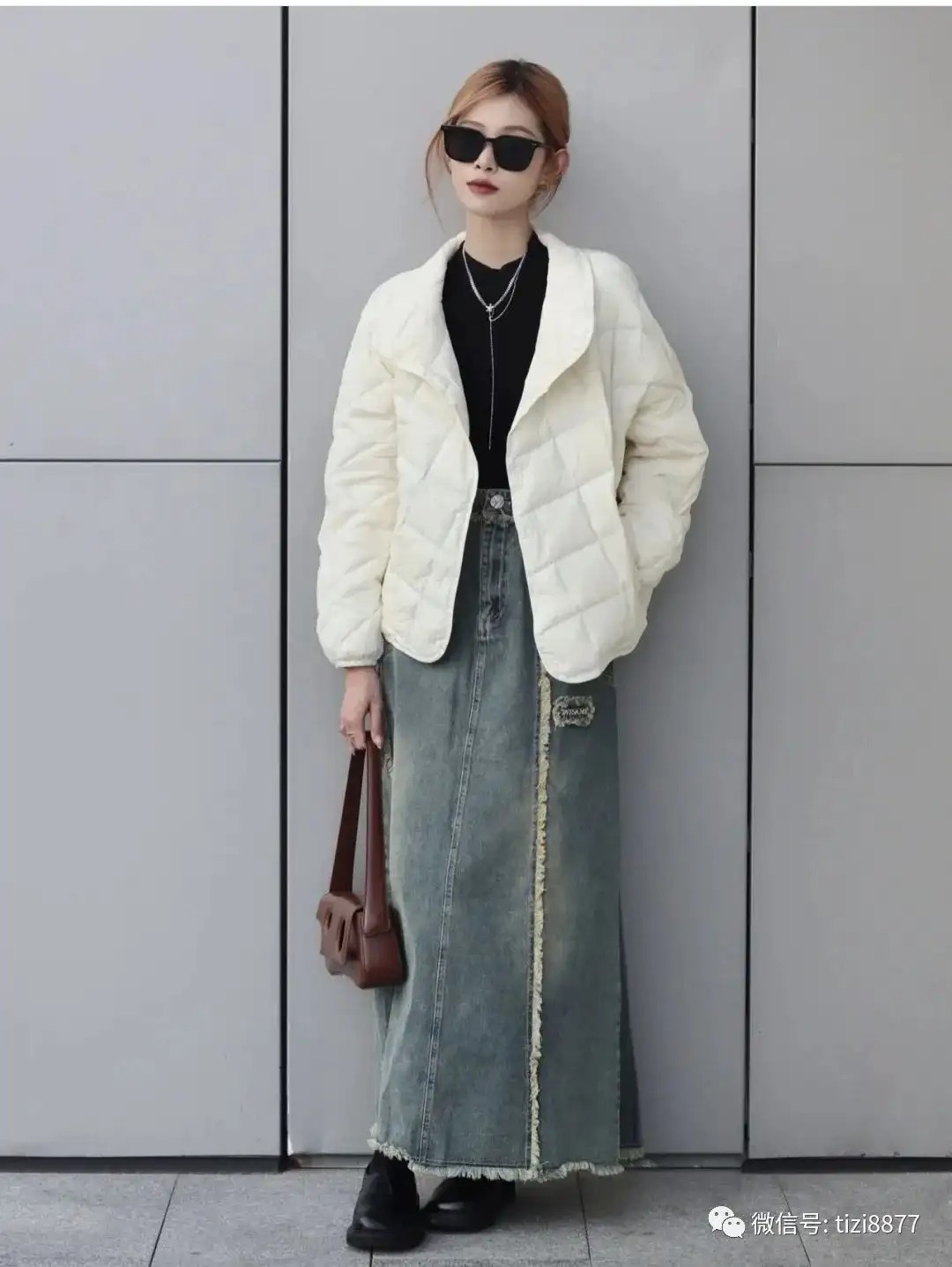 look16 白色短款羽绒服+内搭黑色针织/牛仔半身长裙