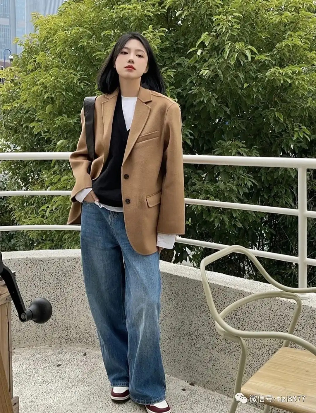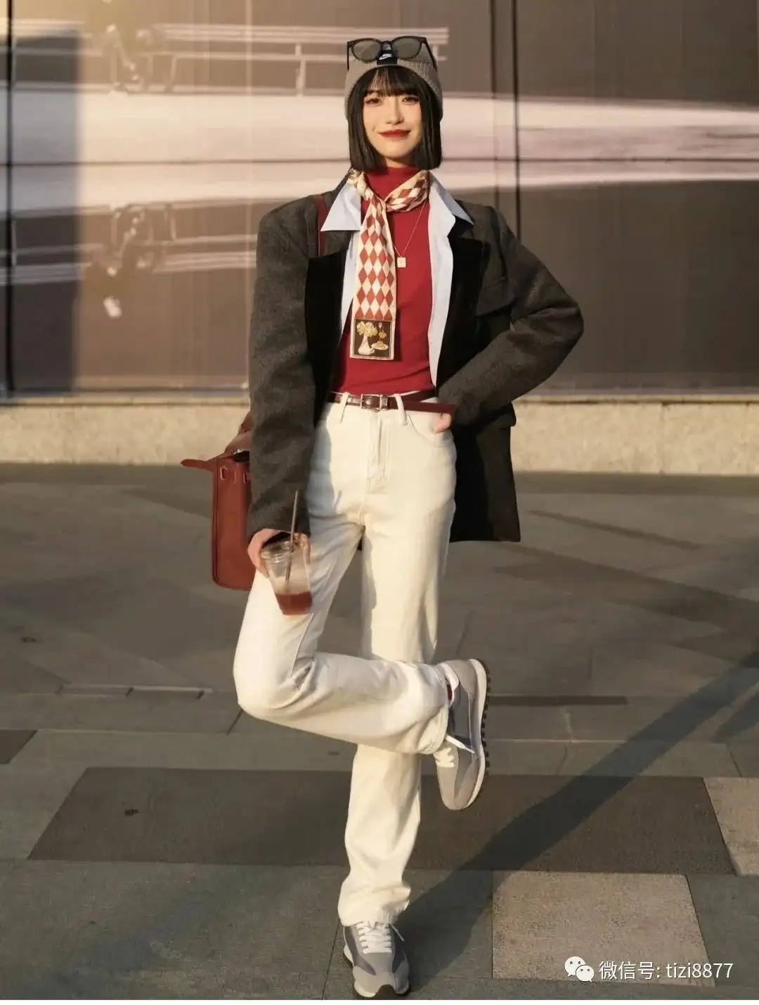 灰色呢子西装是经典耐穿的版型,领口的拼接设计很细节,肩宽适中,不是特别oversize,内搭红色高领打底,羊绒材质很舒服,跟蓝色衬衣撞色莫名很好看,搭配的白色牛仔裤对高妹友好,小直筒裤型很赞,显瘦显腿直~