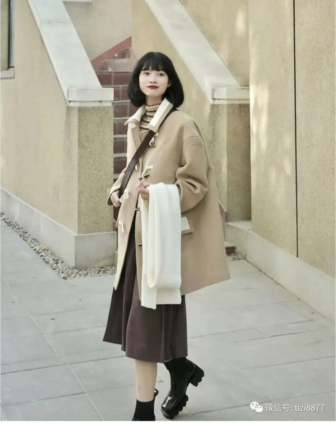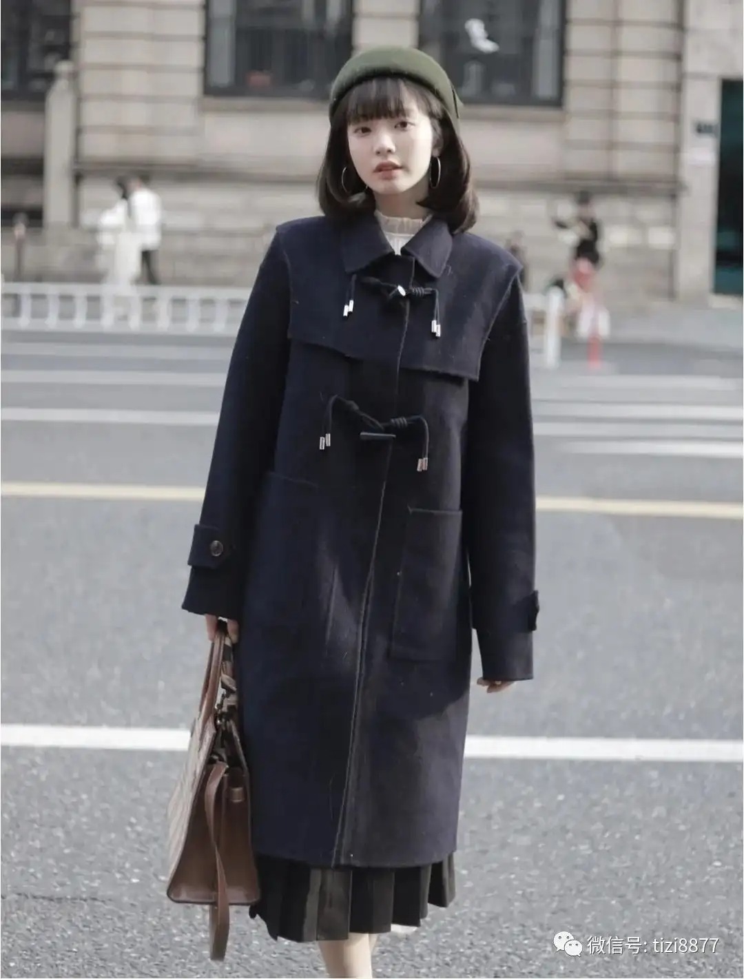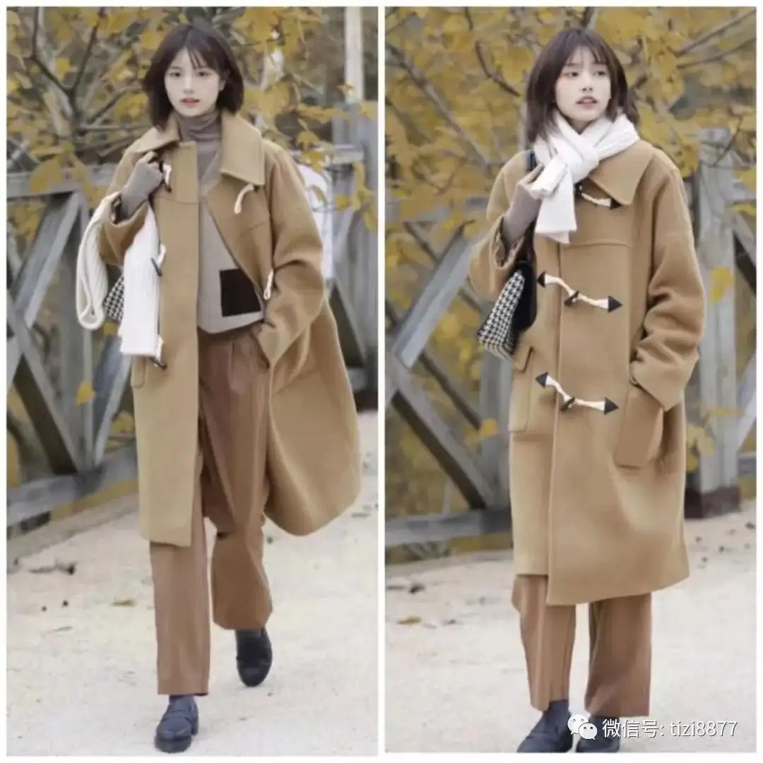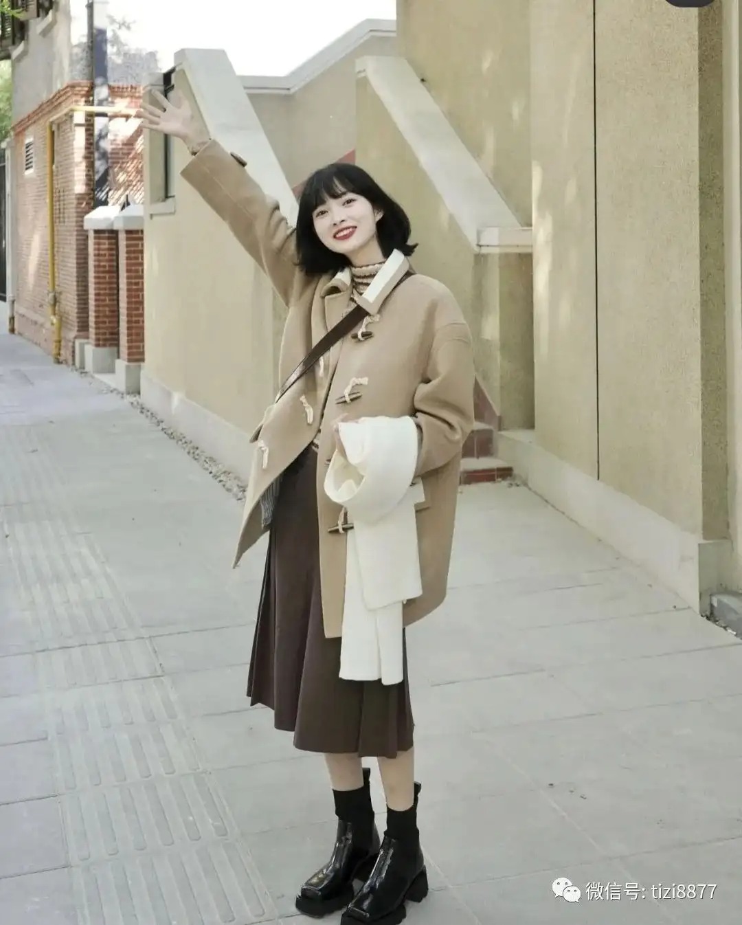 短发+牛角扣就是秋冬氛围感!拥有了秋天的第一件牛角扣大衣,搭配同色系的内搭和百褶裙裤+黑色松糕皮鞋,一套减龄又有学院风!