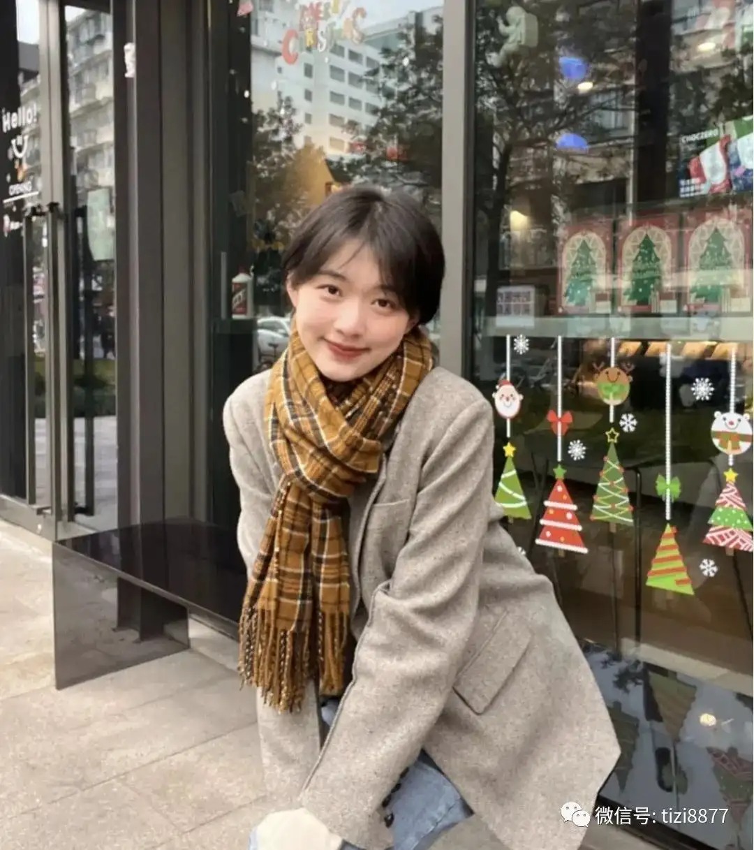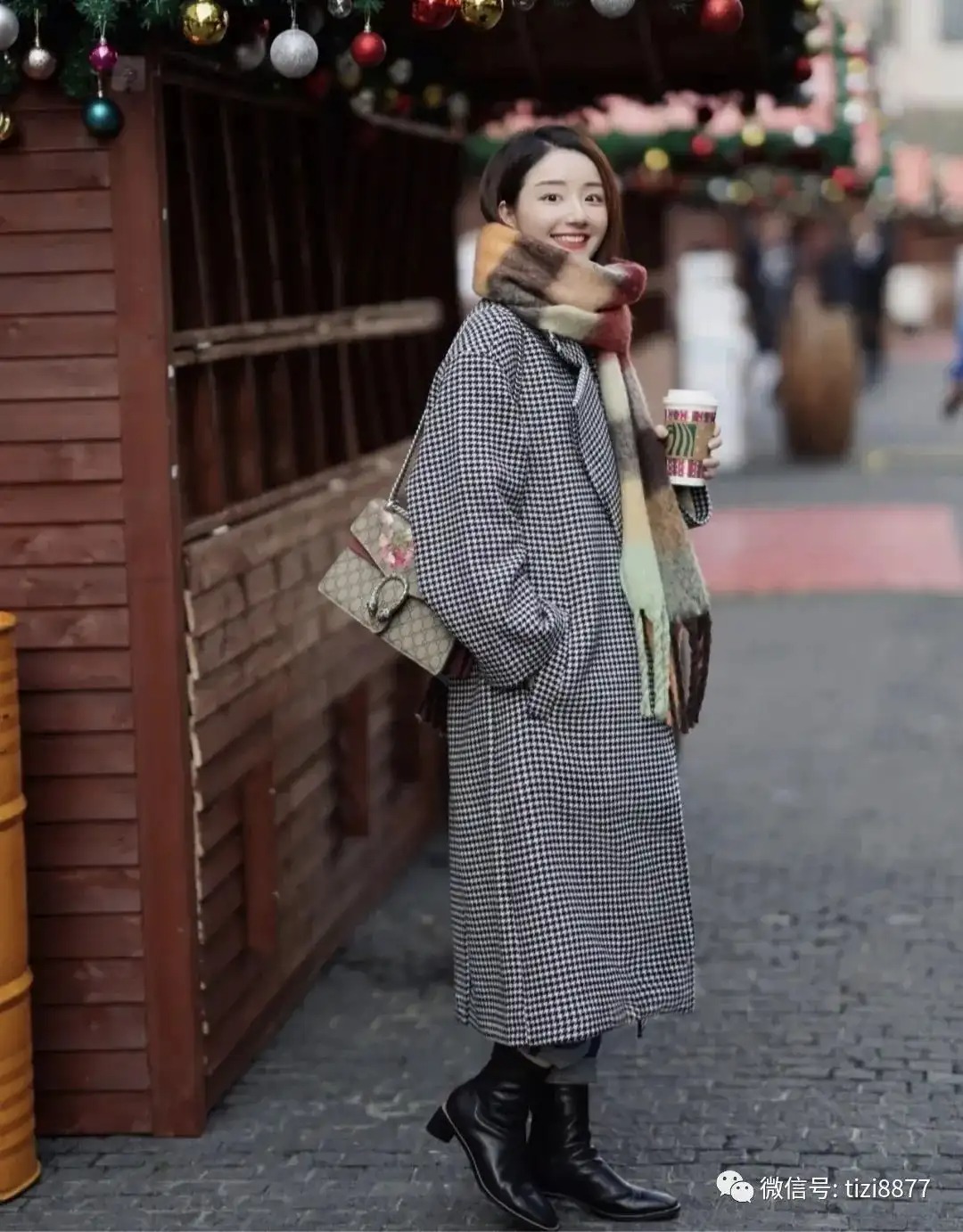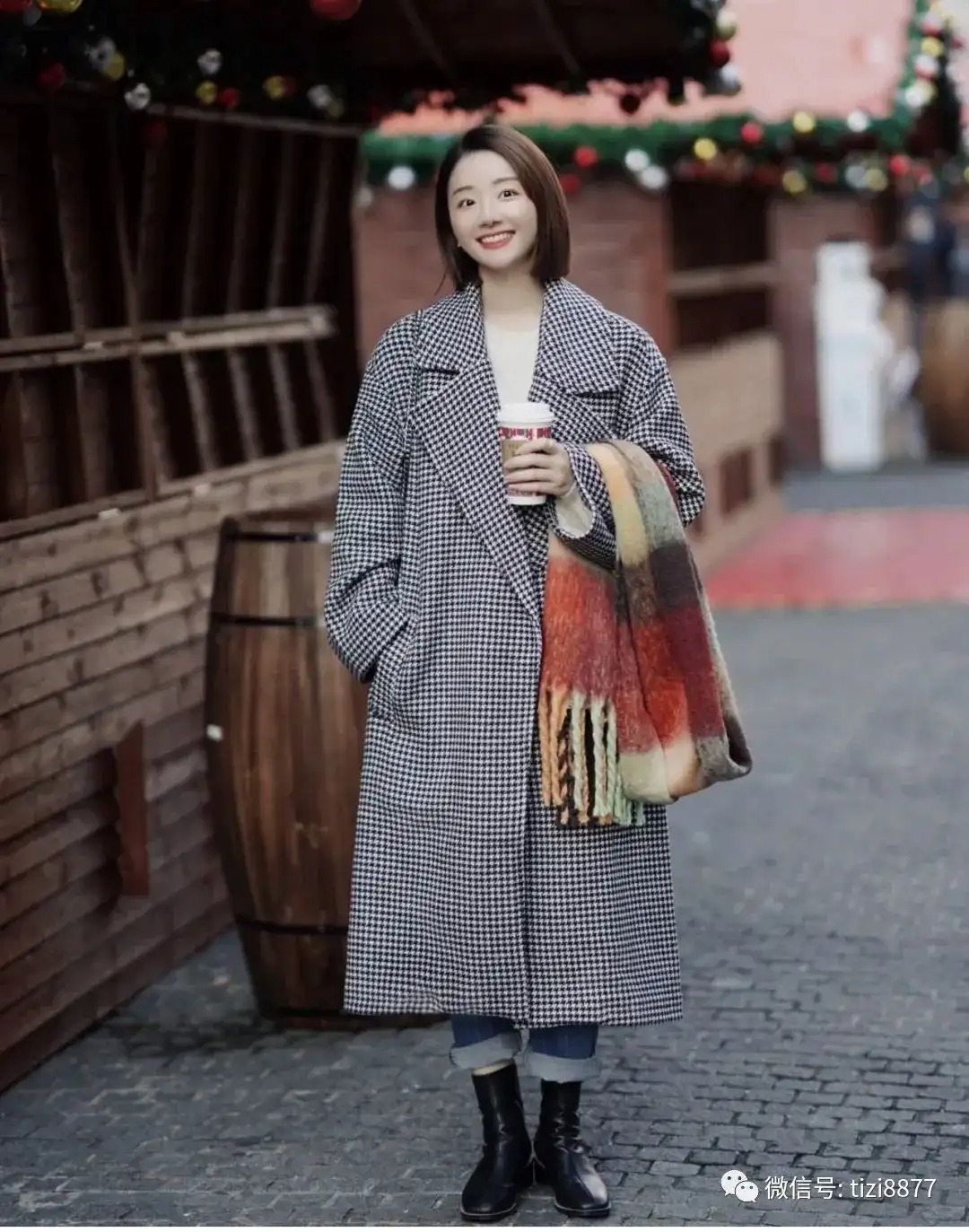 千鸟格大衣加撞色大围巾,版型也是偏爱的廓形大领子,羊毛又兼顾了柔软舒适性,大衣和新发型很配,单穿很飒,搭配牛仔可短款日常通勤均可,是一款可以穿很久的经典~