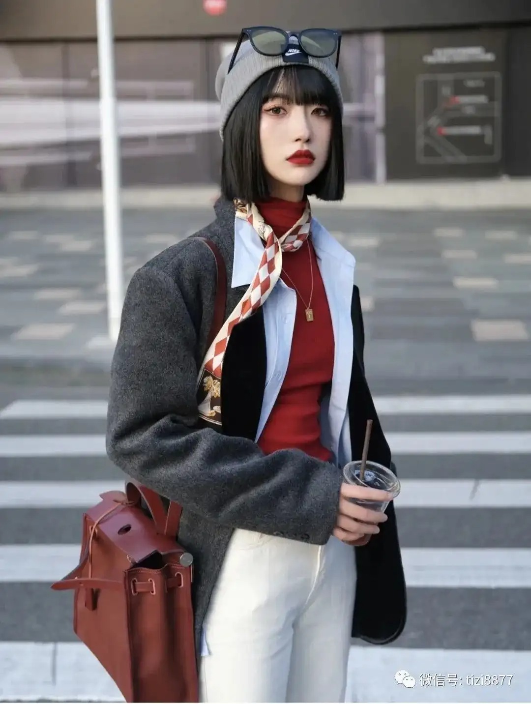 look4 灰色呢子西装+红色高领/蓝色衬衫/白色直筒牛仔裤