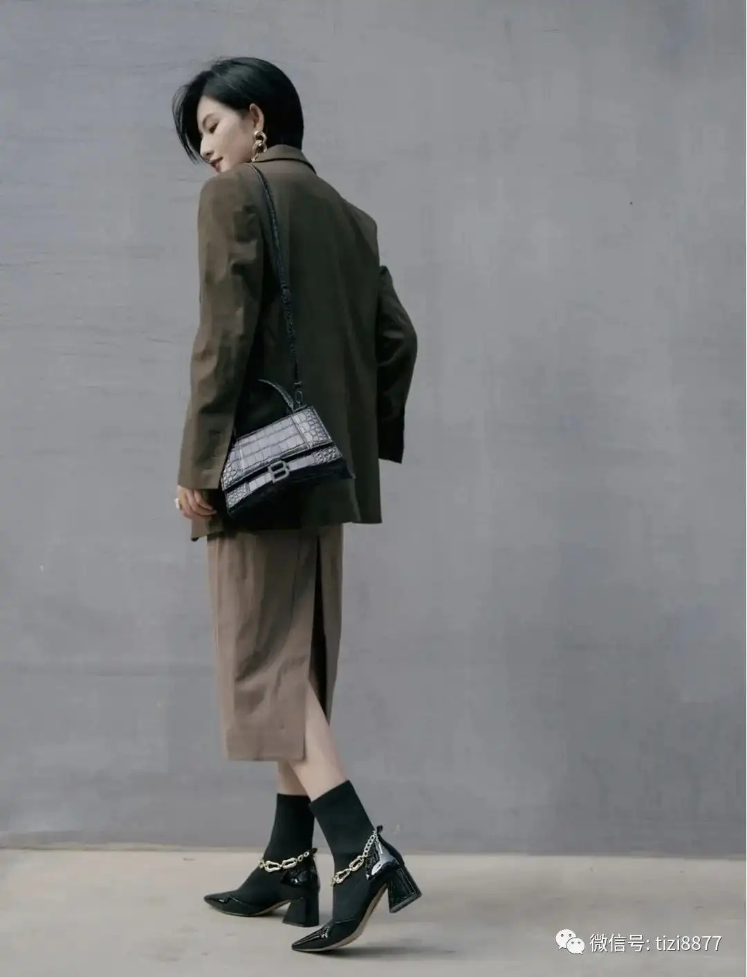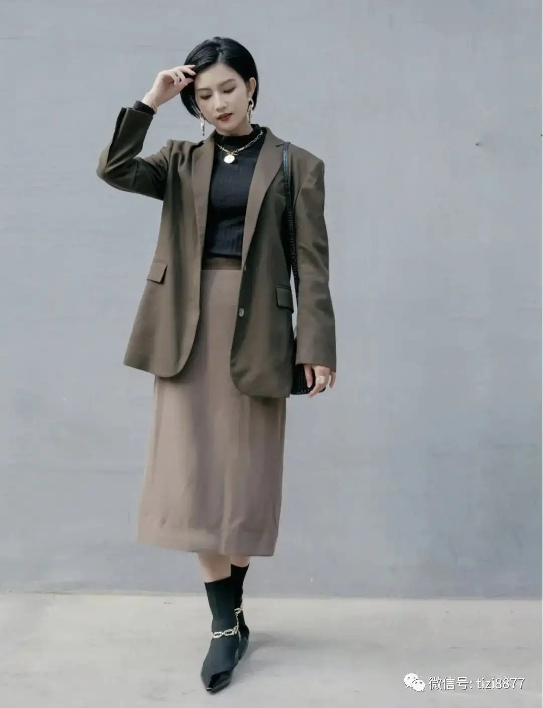 这套是很常穿的秋冬搭配法则,墨绿色系小西装外套+卡其色后开衩半裙+黑色方跟尖头靴,点缀体积大一些、美貌的金色饰品。
