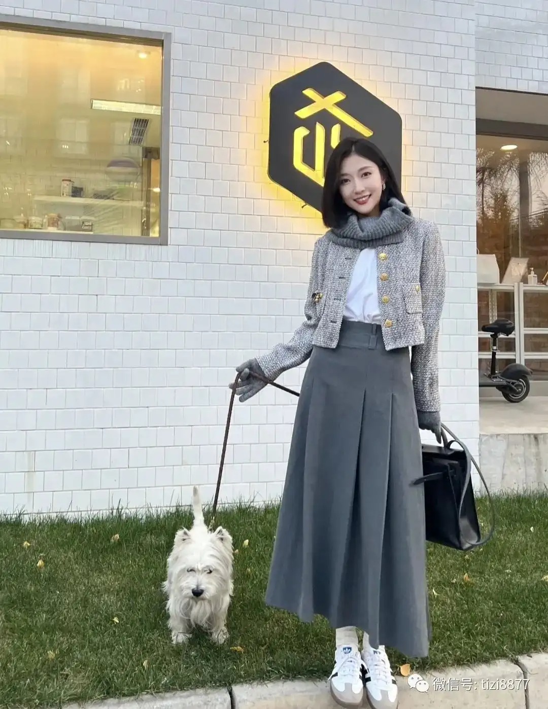 小香风入了不少,这件灰花尼绝对和黑色并列百搭第一名,灰色百褶裙是在试错三次后找到了最适合梨形身材的,miumiu女孩这阵风终于乘上~