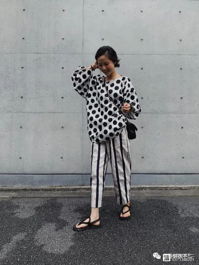 同样是白色大波点衬衣,搭配黑白竖纹萝卜裤后,波点元素与条纹元素相互碰撞,让她看起来摩登又耐看。