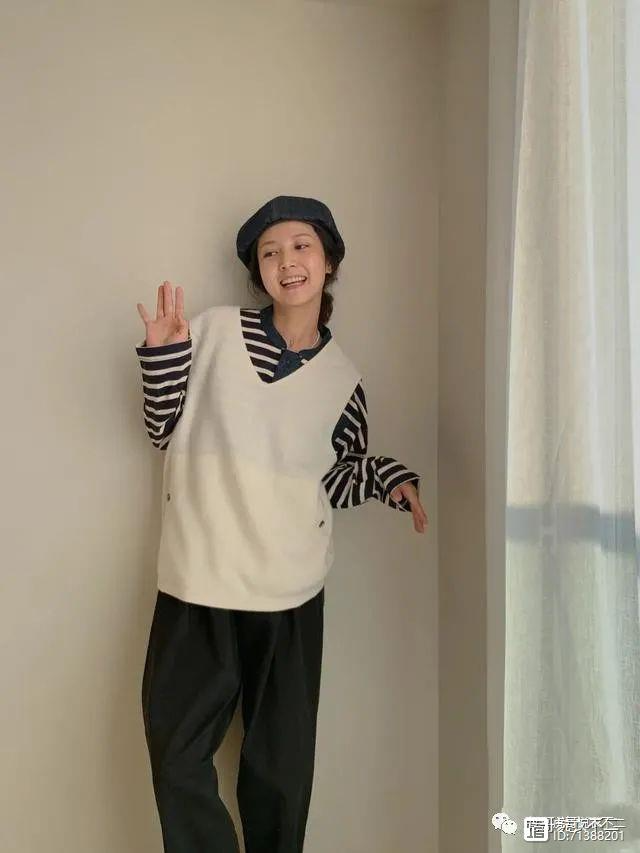 这件米白色坎肩背心版型宽松、色系温柔、材质质感,叠穿条纹打底衫平添几分清新文艺感,黑色宽松阔腿裤呼应海魂衫,配色协调舒适。
