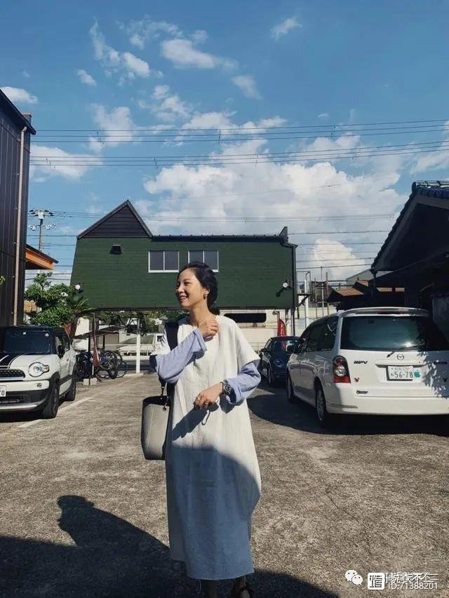 雾霾蓝色长袖T恤叠穿白色宽松感棉麻T恤长裙,里外单品简约舒适,配色简直太养眼了。